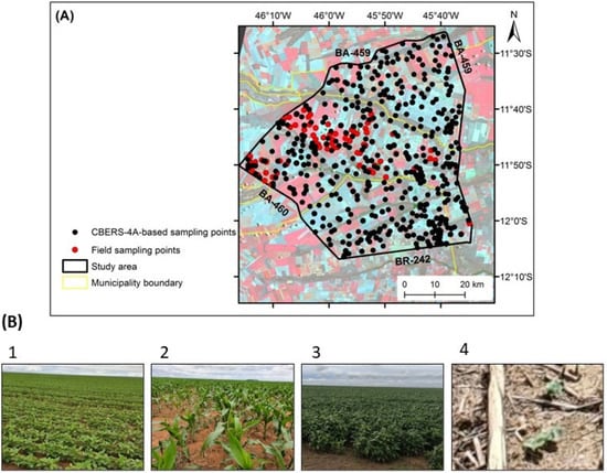 (A) Location of the field sampling points and remote sensing-based reference points. The field campaign was conducted on 29−30 November 2021. The image used for remote sensing-based points was obtained by the CBERS-4A satellite with the overpass on 27 October 2021. (B) Field photos of agricultural fields illustrating the studied crops: (1) soybean; (2) maize; (3) bean; and (4) recently planted cotton (presence of maize straw).