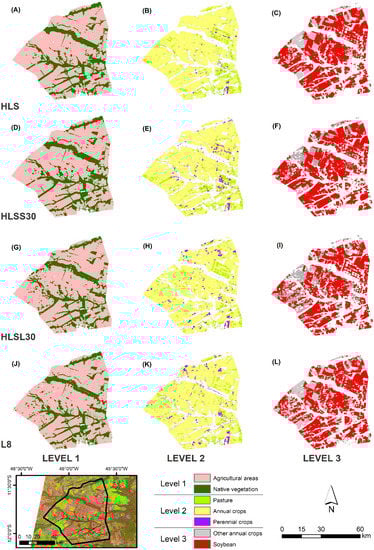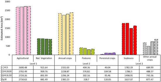 Figure 5 depicts the classification results obtained via RF classifier based on both spectral bands and VIs of HLS, HLSS30, HLSL30, and L8 images for three hierarchical levels. The HLS Level 1 map shows that most of the study area is occupied by agricultural areas, while the remaining native vegetation mostly corresponds to riparian forests. The proportion of agricultural areas identified by our best models were 73% (HLS and HLSS30), 74% (HLSL30), and 75% (L8) of the Soybean Ring, respectively. The annual crops were also similarly assessed as being 86% (HLS), 83% (HLSS30), 84% (HLSL30), and 88% (L8) of the agricultural areas (approximately 60–65% of the entire study area). The L8 and HLSL30 final maps of Level 2 estimated 200% and 138%, respectively, more perennial crops (coffee under irrigation system and silviculture) than the HLS dataset, which means a difference of 80 and 55 km². Indeed, some of the coffee areas were missed by HLS at Level 1, classified as natural vegetation. HLS found 102 and 75 km² more pastures than the HLSL30 and L8 maps, respectively. The datasets differ in Level 3 classifications, as it will be approached in the next session, reflected in the soybean estimations. While the L8 and HLSL30 best models calculated that 68% and 65% of the annual crops at the first growing season were soybean, respectively, HLS estimated a rate of 77% (45% and 49% of the total area), with a difference up to 145 km2 (Figure 6).