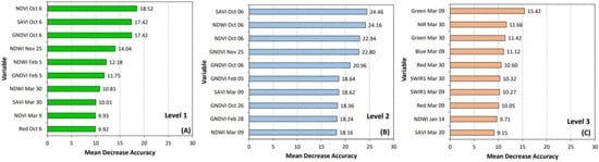 Measures of the importance of the Random Forest top 10 predictor variables for Level 1 (A), Level 2 (B), and Level 3 (C) hierarchical classifications based on the Harmonized Landsat Sentinel-2 (HLS) datasets. The months’ names are abbreviated as Oct (October), Nov (November), Feb (February), Mar (March), and Jan (January).