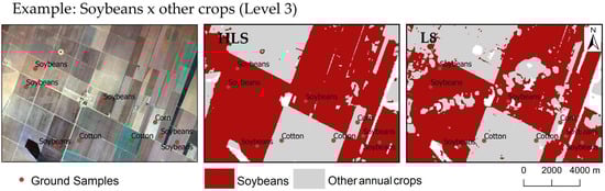 The impact of the higher satellite revisit provided by HLS, although it was not evident in all three levels of models, was noticeable in the mapping results (Figure 5). At Level 3, our main subject, the HLS datasets outperformed HLSS30, HLSL30, and L8 with statistical significance. This difference was evident in the final maps, where the HLS MS + VIs model provided a more confident representation of crops’ spatial distributions over the study area. In contrast, for example, the L8 MS + VIs final map was visibly harmed by the lack of data, presenting a higher occurrence of misclassifications and granular effects (Figure 8). These circumstances may have been due to the spectral similarity between soybean, maize, and cotton. Regionally, all are rainfed and dryland crops with relatively close growth times. Confusion involving soybean and maize can derive from the intercropping between them commonly adopted by local farmers [] and the similarity of crop type phenology and their spectral responses [].