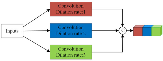 The framework of the CSDC layer is shown in Figure 3. As shown in Figure 3, each CSDC layer consists of three dilated convolutions, and the parameters of a CSDC layer are more than a standard convolution. Replacing all of the standard convolutions in the FCN model with CSDC would directly increase the memory consumption and the calculation burden. Based on the above considerations, we provide a new strategy within the CSDC layer: shared weight. A CSDC layer uses the same kernel and only alters the dilated rate of each sublayer for different scales. As mentioned previously, dilated convolution just inserts “zeros” in standard convolutions; therefore, it is reasonable to share weights in stacked convolutions within a CSDC layer. By sharing weights, the parameters of CSDC layer could be reduced by two-thirds.
