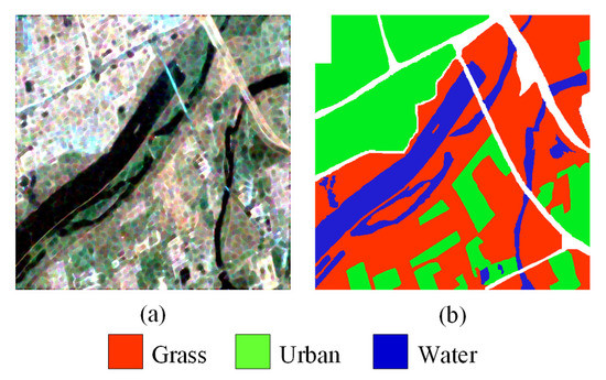 The Xi’an image dataset is a multi-look full polarimetric dataset acquired by Radarsat-2 satellite in C-band, which is shown in Figure 5a, and the corresponding ground truth is shown in Figure 5b. Its resolution is 8 × 8 m, and its size is 512 × 512 pixels. The Xi’an image contains three different terrain categories: grass, urban, and water.