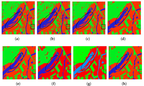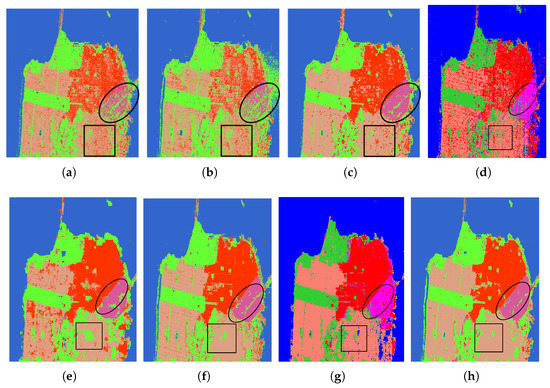 Figure 8 presents the classification results for all classification methods. We mark the prominent improvements with black ovals and rectangles. Figure 8a–c gives the classification results of SVM, Wishart, and Bagging, separately. We can clearly observe that the misclassifications of traditional classifiers are quite serious; in particular, the grass areas are seriously misclassified with urban areas. Figure 8d shows the classification results of CNN; it can be seen that CNN can clearly classify the outline of terrains, especially in the grass areas compared with the three formal algorithms. However, it still hardly distinguishes some pixels between the grass and urban, which has been highlighted by a blank rectangle. Figure 8e,f exhibit the classification results of SFCN and CVFCN, respectively. By contrast, we can distinctly see that the result for the FCN model is clearer and smoother than others, which has been highlighted by a black rectangle. We can also notice that the CVFCN model performs better in water areas, highlighted by a black oval, than the SFCN. This is mainly because the CVFCN model takes full advantage of the phase information of PolSAR datasets. Figure 8g,h present the results of Unet and our proposed method, which present better contextual consistency.