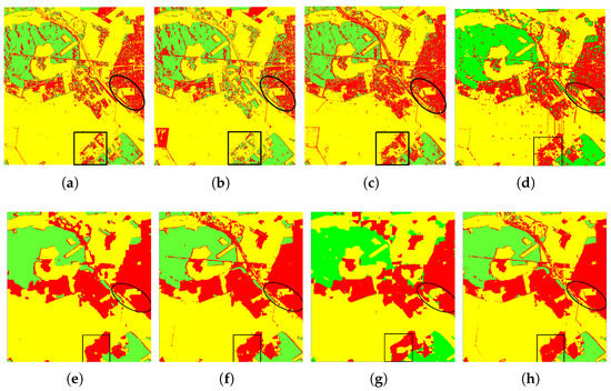 The classification results of different methods are shown in Figure 10a–h, in which the outstanding regions are marked with ovals and squares. Figure 10a–c show the visual classification results of SVM, Wishart, and Bagging. From Figure 10a,b, we can see that it is worst at distinguishing the developed and low-density areas that have been highlighted. The classification effect of Figure 10d is more clear compared with the formal methods, especially in low-density and developed areas; however, there are still some misclassified pixels. Figure 10g shows the result map of Unet; we can see that the classification effect in the vegetation area is very good compared with that of other methods. From Figure 10h, it can be seen that the effect of CV-SDFCN is further improved, especially in developed areas and low-density areas.