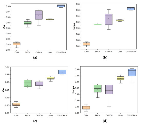 Tested on Oberpfaffenhofen and San Francisco datasets, accuracy boxplots of deep learning methods are shown in Figure 11. Different colored square represents different classification method. The box and horizontal line in colored square mean the average evaluation index. The boxplot in a more compact form means lower dispersion and stronger robustness. From Figure 11a,b, we can see that in the Oberpfaffenhofen dataset, the performance of our proposed structure is better than that of all other structures. What is more,the performance of Unet and CNN is more stable than that of other networks. The OA and Kappa values of CV-SDFCN are around 98% and 97%, respectively, which are far higher than those of CNN, which are 91% and 85%. It can be seen from Figure 11c,d that our network performance is also the best on the San Francisco dataset: the network performance is more stable, and the values of OA and Kappa are also the best. Therefore, the structure we proposed is more effective than all other structures.