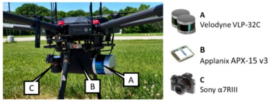 In this study, two in-house developed UAV systems were used—denoted as UAV-1 and UAV-2. The UAV-1 (as shown in Figure 1) payload consists of a Velodyne VLP-32C LiDAR [57] and a Sony α7R III camera. The payload of the UAV-2 is the same as UAV-1 except for its camera, which is a Sony α7R camera. The LiDAR data were directly georeferenced through an Applanix APX15 v3 position and orientation unit with an integrated global navigation satellite system/inertial navigation system (GNSS/INS) [58]. The VLP-32C scanner is a spinning multi-beam LiDAR unit assembled with 32 radially oriented laser rangefinders. Unlike linear LiDAR systems, which have only one laser beam, a multi-beam LiDAR rotates and fires multiple beams in different directions, which mitigate occlusion problems since an object space location can be captured by multiple laser beams at different times. The rotation axes of the LiDAR units on both UAV systems were set to be approximately parallel to the flying direction. To obtain the most accurate point cloud possible, a point is only reconstructed when the laser beam pointing direction is less than ±70° from the nadir. System calibrations of these two UAV systems were conducted using an in situ calibration procedure [59]. The expected accuracy of the acquired point cloud was estimated based on the individual sensor specifications and system calibration accuracy using a LiDAR Error Propagation calculator [60]. At a flying height of 50 m, the calculator suggests that the horizontal/vertical accuracy values are within ±5–6 cm at the nadir position. At the edge of the swath, i.e., ±70° from the nadir, the horizontal/vertical accuracy values would be within ±8–9 cm and ±5–6 cm, respectively.