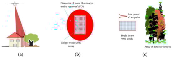 Unlike traditional linear LiDAR, which has high signal emission power and a low-sensitivity receiver, Geiger-mode LiDAR is a relatively new technology that has low signal emission power and a high-sensitivity receiver. The beam divergence of a Geiger-mode LiDAR is large (e.g., a cone) and can illuminate a large area, as shown in Figure 2a. The returning signal covers the entire field of view (FOV) of its 2D receiver, which consists of an array of Geiger-mode Avalanche Photodiode (GmAPD) detectors, as shown in Figure 2b. The GmAPD detectors are designed to be extremely sensitive. Compared to linear LiDAR with a low-sensitivity receiver, which requires hundreds of photons to record a response, the GmAPD detectors record the energy reflected from a single photon [61]; thus, measurements were acquired at a much higher density [62,63] than linear LiDAR systems. The design of the Geiger-mode LiDAR system allows for it to operate at a lower energy, higher altitude, and faster flying speed. In this study, the Geiger mode LiDAR dataset was provided by VeriDaaS Corporation. The VeriDaaS system has an array of 32 by 128 GmAPD detectors, as shown in Figure 2c, which effectively collect 204,800,000 observations per second when using a pulse repetition rate of 50 kHz. The use of a Palmer scanner, together with a 15° scan angle of the laser and scan pattern with a 50% swath overlap, enables multi-view data collection, which can minimize occlusions. This system is directly georeferenced through an Applanix POS AV 610 [64].