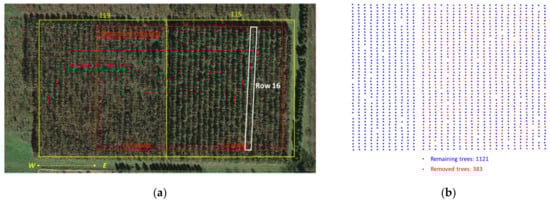 The data collection site is located at Martell Forest, a research forest owned and managed by Purdue University, in West Lafayette, IN, USA. The study site consists of two plantation plots (shown in Figure 3a)—Plot 115 and Plot 119—which were planted in 2007 and 2008, respectively. The region of interest (ROI) contains 11 rows from Plot 119 and 21 rows from Plot 115. Row 16 in Plot 115 (highlighted by the white box in Figure 3a) will be used in the qualitative analysis in the experimental results (in Section 4). The main species of these two plots is northern red oak (Quercus rubra) with burr oak (Q. macrocarpa) as the training species. Trees in these two plots were planted in a grid pattern. The row spacing (east–west direction) was approximately 5 m, and adjacent tree spacing in a given row (north-south direction) was approximately 2.5 m. The tree heights ranged from 10 to 12 m when measured at year 13. The average DBH was 11.3 cm and 12.7 cm in Plots 119 and 115, respectively. The understory vegetation, e.g., herbaceous species and voluntary seedlings, was controlled on an annual basis for Plot 115 but not in Plot 119. In 2021, there were in total of 1504 trees in the ROI. It should be noted that a tree-thinning activity took place in late February 2022 on Plot 115, and 383 trees were cut down, as shown in Figure 3b.