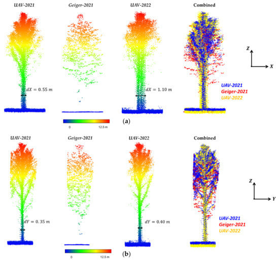 A sample tree from the UAV-2021, Geiger-2021, and UAV-2022 datasets (colored by height) as well as the combined one (colored by dataset ID) from the views in (a) X-Z and (b) Y-Z planes.