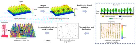 In this study, tree detection, localization, and segmentation are conducted through four main stages: point cloud height normalization, the partitioning of potential trunk points, the detection and localization of tree trunks, and individual tree segmentation. This is schematically illustrated in Figure 7. As mentioned in Section 1, three different strategies will be adopted at the third stage in this framework for comparative analysis. In this subsection, a summary of each stage will be introduced.