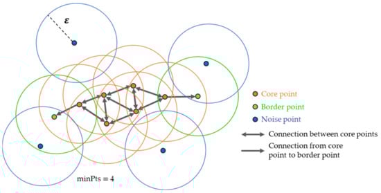 - Ester, M.; Kriegel, H.-P.; Sander, J.; Xu, X. A Density-Based Algorithm for Discovering Clusters in Large Spatial Databases with Noise. In Proceedings of the 2nd International Conference on Knowledge Discovery and Data Mining, Portland, OR, USA, 2–4 August 1996. [Google Scholar]