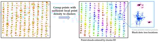 The use of a DBSCAN algorithm to detect and locate trunks relies on the hypothesis that higher point density corresponds to tree location. DBSCAN is an algorithm developed to detect clusters in large spatial datasets with noise [67,68]. This algorithm requires two pre-defined thresholds: the neighborhood distance threshold denoted by and the minimum number of neighboring points . Three types of points are defined by DBSCAN: core points, border points, and noise points. Starting from a random seed point that has not been classified, the number of points in this neighborhood with the radius of is counted. If the number of points (including the seed point itself) is not smaller than , this seed point is defined as a core point. Then, the same procedure is performed on the neighboring points of this core point . If enough neighboring points are identified, this point is considered a core point that is connected to core point ; otherwise, this point is considered a border point. The process subsequently identifies core points and border points from existing seed points until no new core points are identified. Ultimately, the connected core points and border points form a cluster (i.e., an individual tree in this study). The remaining points with insufficient points in their neighborhood are classified as noise points. The above steps are illustrated in Figure 8. It is worth mentioning that, in this study, the DBSCAN algorithm is performed on the planimetric coordinates of the LiDAR points. All LiDAR points within the hypothesized trunk portion are either included in clusters or classified as noise points. Finally, the trunk location is computed as the centroid of the respective cluster. Figure 9 illustrates a sample result from the DBSCAN-based approach.