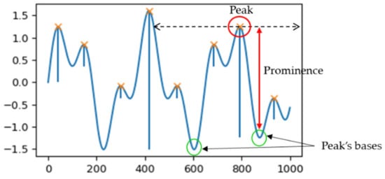 The height/density-based tree detection and localization approach was proposed by Lin et al. [51] based on the hypothesis that a higher point density and higher elevation correspond to trunk locations. Initially, 2D cells with size of are created along the XY plane over the hypothesized trunk portion. The sum of elevations of all points within each cell is evaluated. This metric reflects the point density and height of the point cloud in a local neighborhood. Then, a 2D peak detection process is carried out to identify the local maxima of the metric, which would correspond to trunk locations. Two parameters are used for peak detection: size of the square local neighborhood in 2D () and minimum prominence of a peak (). The former is used to define the region where, at most, one peak can be selected as a detected tree, while the latter is a measurement of how much a peak stands out from the surrounding bases of the signal, as illustrated in Figure 10 for a 1-D case. For each peak, a horizontal line (dashed line in the figure) from the current peak is extended until it either reaches the border of the local neighborhood or intersects with the signal at the slope of a higher peak. Within this range, the base with the largest value is used to compute the prominence as the difference between the peak and this base. For each local neighborhood, the peak with the largest prominence value is selected as a detected tree as long as the value is larger than . Moreover, the tree location is derived as the center of this cell. A sample result illustrating the height/density-based approach is shown in Figure 11.
