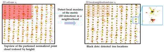 - 2D local neighborhood size, : Given that only one tree will be detected from a local neighborhood, the size is determined based on prior knowledge related to tree spacing within the ROI.