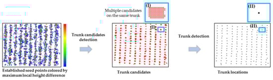 To avoid the requirement for fine-tuning the parameters, we proposed a tree detection and localization approach that does not rely on point density. Instead, tree geometry is used in this approach by assuming that the tree trunk grows vertically and high local height differences correspond to trunk locations. Using the partitioned normalized height point cloud as input, tree detection and localization are performed in three main steps: estimation of maximum local height difference within a local neighborhood, trunk candidate selection, and trunk detection/localization, as illustrated in Figure 12.