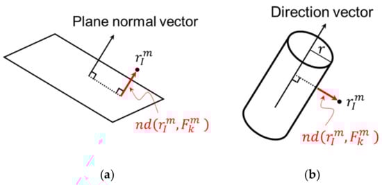 Schematic diagram illustrating the normal distance from each LiDAR point to its corresponding parametric model: (a) planar features for terrain patches and (b) cylindrical features for tree trunks.