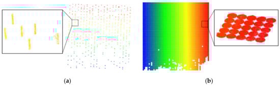 UAV-2021: This dataset was captured by the UAV-1 system on 13 March 2021. The UAV was flown at 40 m above-ground at a speed of 3.5 m/s. The lateral distance between adjacent flight lines was 11m. The side lap percentage of the point cloud is 95% when considering ± 70° off-nadir reconstruction. As mentioned in Section 2.1.1, the horizontal and vertical accuracy of the derived point cloud is within the range of 5–6 cm at nadir position. The dataset has high point density and geometric accuracy. The reconstructed point cloud after normalizing the height information relative to the ground level (i.e., normalized height point cloud) [41] and density map of this dataset are shown in Figure 4a. The height normalization step will be introduced in the Section 3.