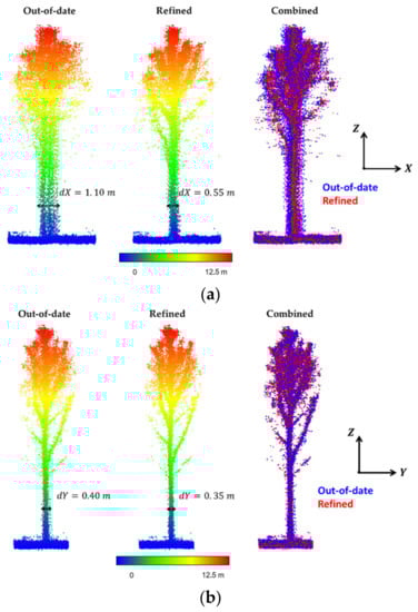 As mentioned in Section 2, the mounting parameters of the UAV-2 system are out-of-date, leading to an inaccurate point cloud. Point cloud misalignment is observed at the tree trunks as well as the terrain. In this study, we proposed a novel UAV LiDAR system calibration approach relying on the identified features in a forest. The features used for the calibration process include tree trunks and planar patches. The former are modeled as cylindrical features; the latter are modeled as planar features. The conceptual basis of such calibration is that inaccurate system calibration parameters will result in a misalignment of LiDAR points corresponding to the same feature. By minimizing the discrepancy related to these features, system calibration parameters can be refined through a non-linear least-squares adjustment (LSA) process.
