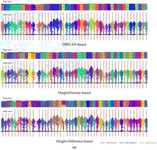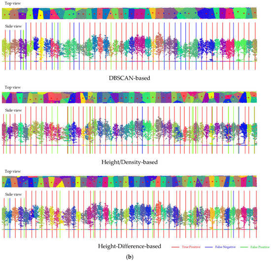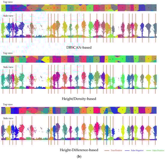 Tree detection and segmentation results from the three approaches for (a) UAV-2021 and (b) UAV-2022-High-Acc datasets. The normalized height point clouds are colored by tree ID from the segmentation, correct detections (true positive) are shown in red, false negatives are shown in blue, and false positives are shown in green.