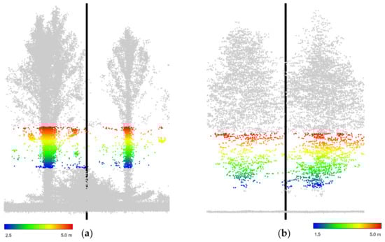 Figure 18. Sample false-positives from the height-difference-based approach for (a) UAV-2022-High-Acc and (b) Geiger-2021 datasets, the points within the range threshold are colored by height while the others are shown in grey—the black line represents the falsely detected tree location. - In terms of the Geiger-2021 dataset with low point density, the performance of all approaches dramatically deteriorated. Among them, the height-difference-based approach correctly detected the greatest number of trees, followed by the height/density-based and DBSCAN-based approaches. This is expected as the height-difference-based approach does not rely on density information for tree detection. Figure 18b shows a commission error from the Geiger-2021 dataset. It can be observed that points from the branches and noise points between two trees lead to a false positive. By looking into false positive detections as shown in Figure 18, an additional post-processing step (i.e., a quality control process) can be proposed to remove them based on density information and/or by analyzing the vertical spatial distribution of the points within the local neighborhood. Therefore, false positive detections are preferable to false negatives, as the former can be removed relatively easily while finding omission errors is challenging. Overall, although the commission errors are higher than the DBSCAN-based approach, the height-difference-based approach is more suitable for performing tree detection for point clouds with a low point density.