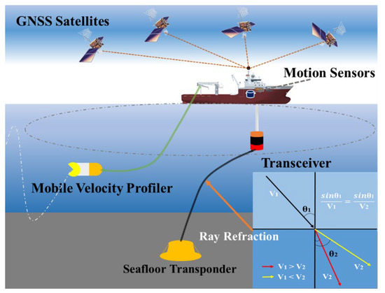 where n is the number of acoustic observation pairs. When the average sound velocity along the actual ray path is expressed as , the Euclidean distances and the transceiver and the transponder position can be calculated with the least square (LS) method; see Appendix A.