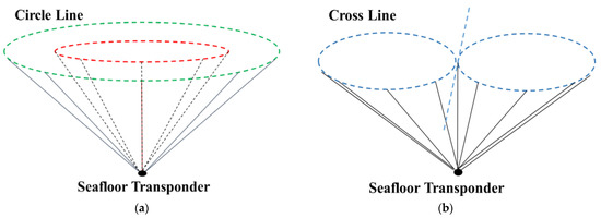 In this research, the horizontal and vertical position are estimated to utilize a step-by-step method for moving survey data. We design two kinds of calibration survey lines, as shown in Figure 3: one is the circular line (Figure 3a), the other is the cross line (Figure 3b).