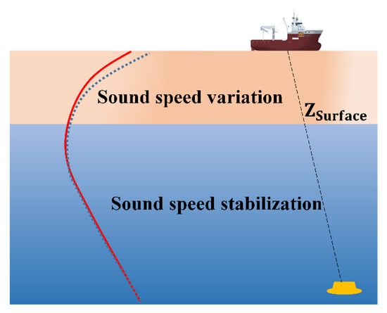 As shown in Figure 2b, if the sound velocity error is negligible, based on Equation (A2) and the least-squares methods, the correction of can be estimated as follows: