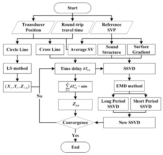 As shown in Figure 5, for estimating the vertical position and SSVD, two kinds of calibration survey line observations are used to estimate the horizontal position and vertical position, respectively. The horizontal position calculated by the circle line is used directly to estimate other unknown parameters. We utilize a certain acoustic velocity structure to estimate the vertical position with the cost function . Then, we recompute the vertically normalized travel time delay. The SSVD is extracted using the above SRT method. We iterate this process until the position parameters converge.