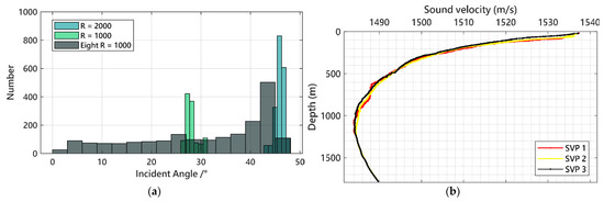 As shown in Figure 8a, the average incident angles of the big circle and small circle are 43° and 28°. The incident angles of the cross line (eight track) are distributed from 0° to 45°. Three sound velocity profilers in seawater were measured by MVP 300 from the AML Oceanographic company, and the resulting profiles are shown in Figure 8b. The time span of these extracted data was approximately 6 h, ranging from 3:40:00 to 8:20:00 in Coordinated Universal Time (UTC). The average profile of three SVPs is utilized as the reference SVP in this study, and the mean velocity is about 1492 m/s.