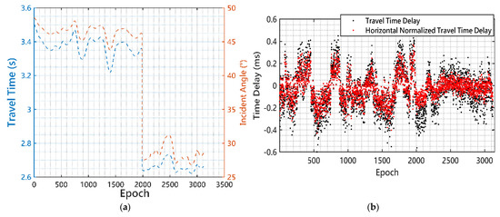 The acoustic round-trip travel time and incident angle of the circle line (a). The travel time delay and horizontal normalized travel time delay of the circle line (b).