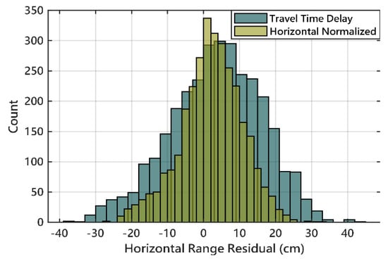 The travel time delay and horizontal normalized travel time delay are utilized to estimate the horizontal position with LS method, respectively. Figure 10 shows the histogram of acoustic horizontal range residuals for two LS methods. The RMS of the range residuals for travel time delay and horizontal normalized travel time delay are 13.21 and 8.26 cm, respectively. In addition, the range residuals had mean values of 3.48 and 2.12 cm, respectively. Even though the horizontal range precision in horizontal positioning is limited by systematic errors, the mean value of slant range residuals for the circle line is close to zero. Furthermore, the horizontal position can be utilized to estimate the vertical position and surface sound velocity disturbance.