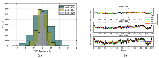 The histogram of surface sound velocity disturbance with different surface reference depths (a). The intrinsic mode functions of surface sound velocity disturbance with different reference depth using the IMF method (b).