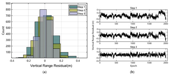 The vertical position and SSVD can be estimated by the new numerical iterations approach mentioned in Section 3.3. The new SSVD is constructed using IMFs of different cycles and is then used to iteratively calculate the vertical component. As shown in Figure 13a,b, the vertical range residual with different iterations reduced step by step, and the periodic fluctuations associated with SSVD were gradually eliminated.
