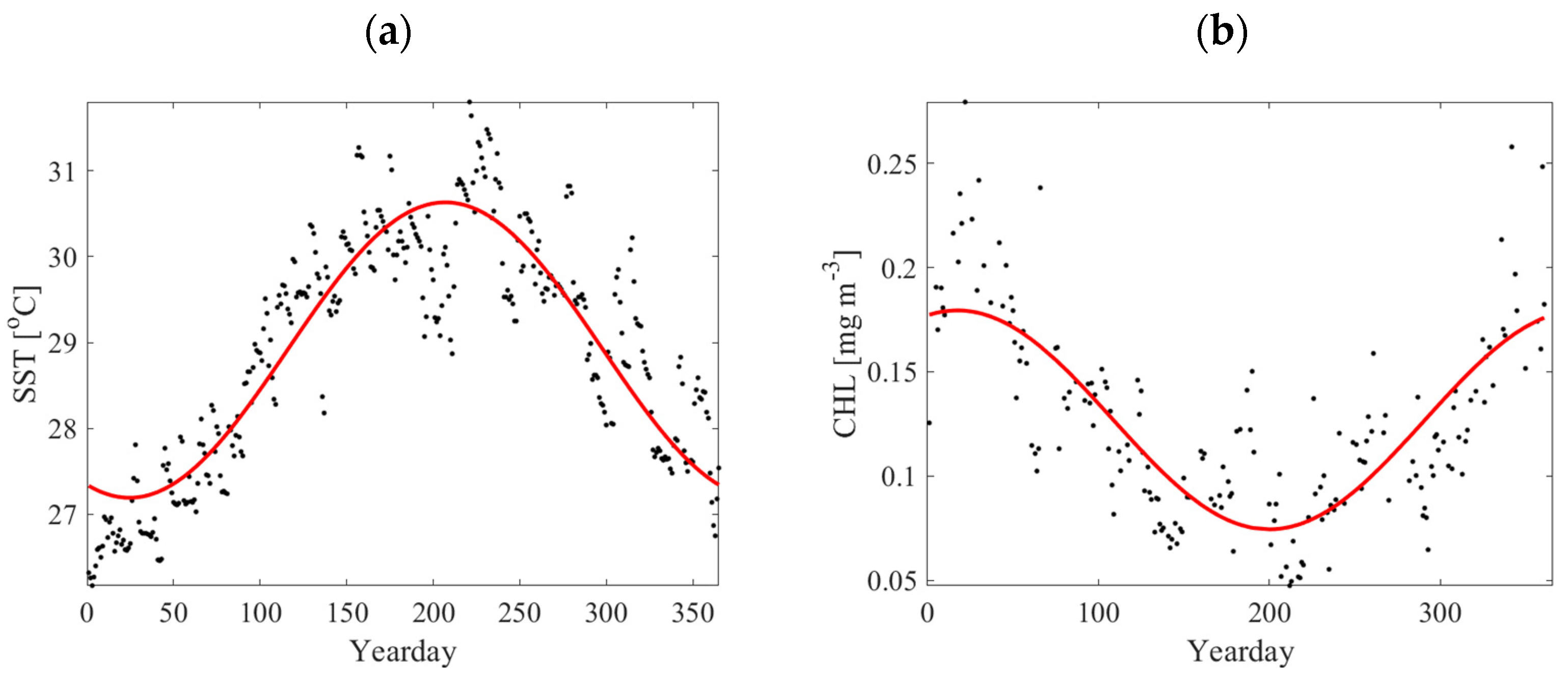 - Müller-Karger, F.E.; Walsh, J.J.; Evans, R.H.; Meyers, M.B. On the seasonal phytoplankton concentration and sea surface temperature cycles of the Gulf of Mexico as determined by satellites. J. Geophys. Res. Ocean. 1991, 96, 12645–12665. [Google Scholar] [CrossRef] [Green Version]
