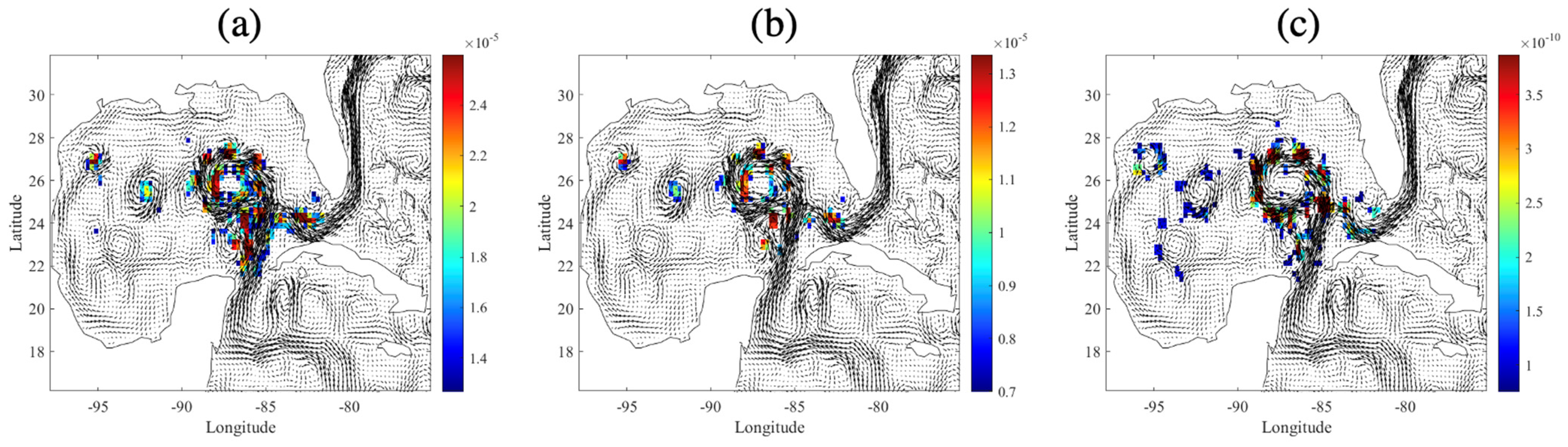 - Yang, Y.; Weisberg, R.H.; Liu, Y.; San Liang, X. Instabilities and multiscale interactions underlying the loop current eddy shedding in the Gulf of Mexico. J. Phys. Oceanogr. 2020, 50, 1289–1317. [Google Scholar] [CrossRef]