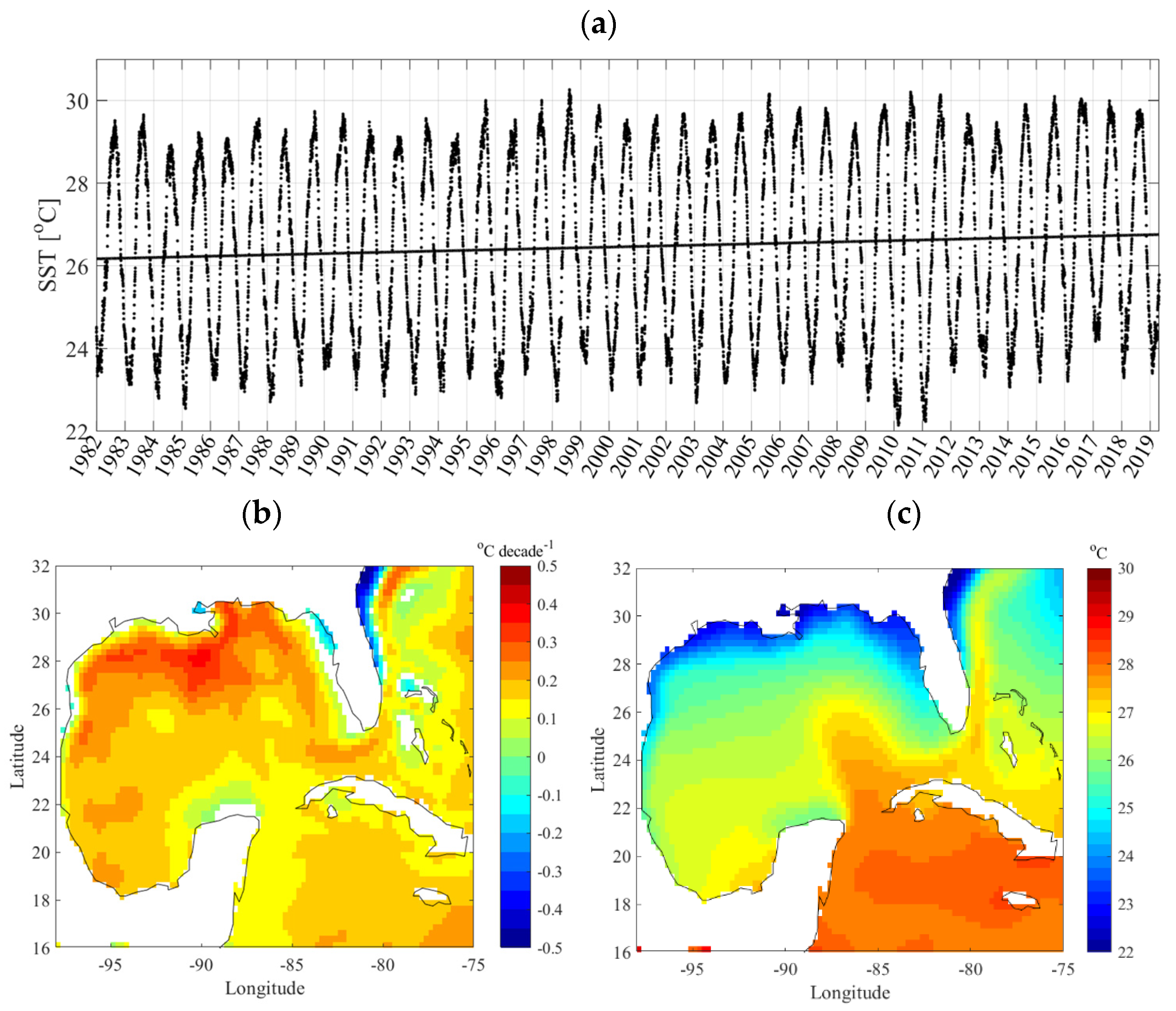 - Muller-Karger, F.E.; Smith, J.P.; Werner, S.; Chen, R.; Roffer, M.; Liu, Y.; Muhling, B.; Lindo-Atichati, D.; Lamkin, J.; Cerdeira-Estrada, S.; et al. Natural variability of surface oceanographic conditions in the offshore Gulf of Mexico. Prog. Oceanogr. 2015, 134, 54–76. [Google Scholar] [CrossRef] [Green Version]