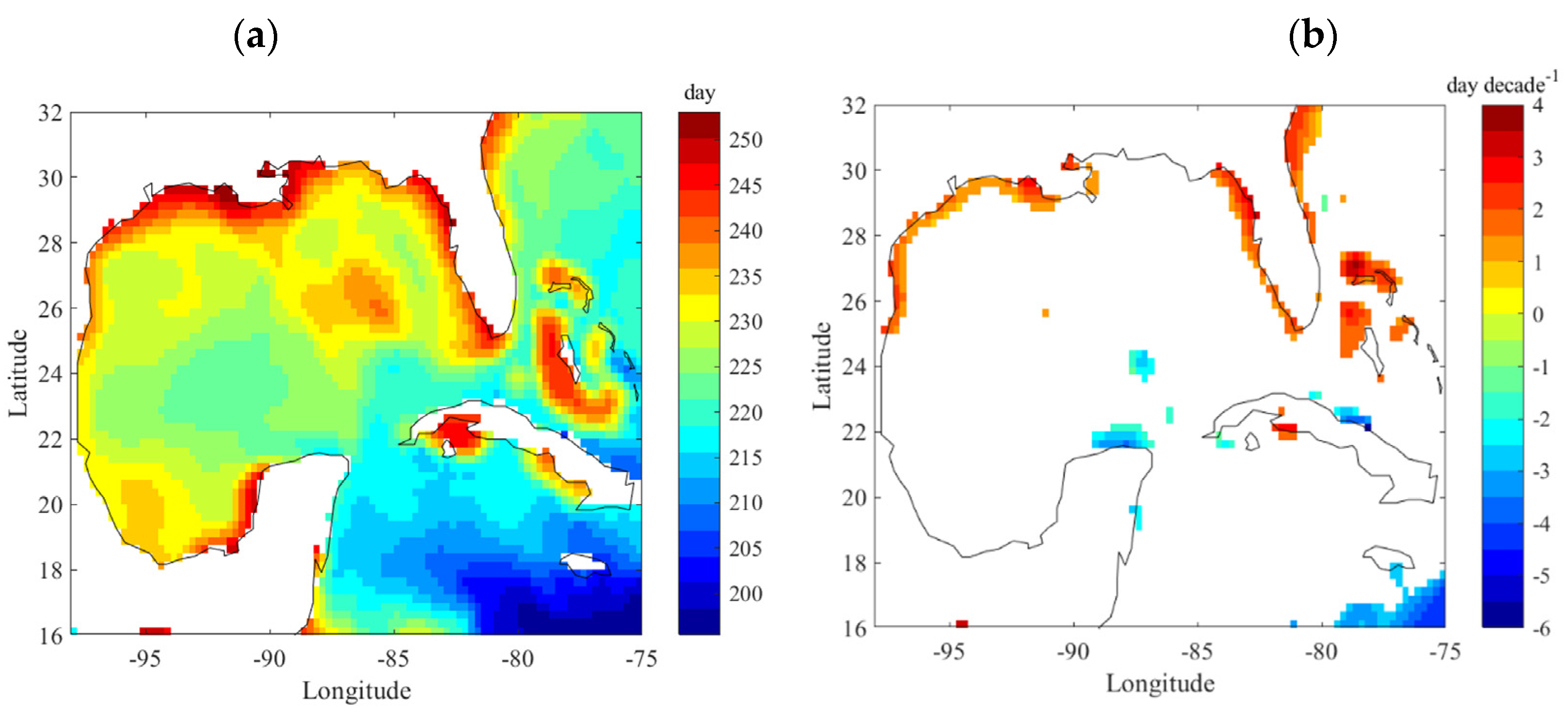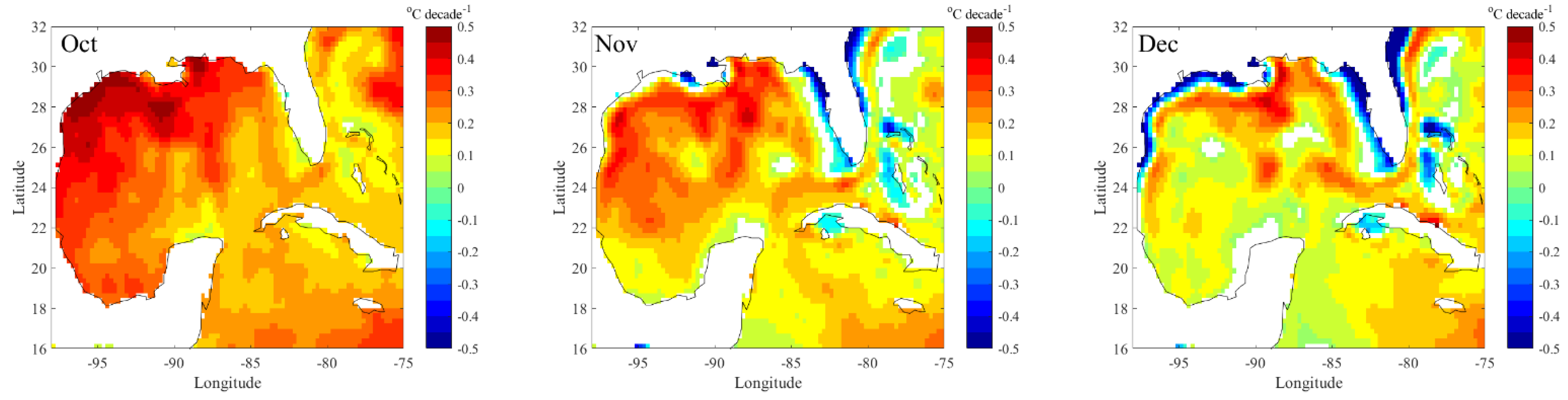 - Wang, Z.; Boyer, T.; Reagan, J.; Hogan, P. Upper Oceanic Warming in the Gulf of Mexico between 1950 and 2020. In Proceedings of the GoMCon, Baton Rouge, LA, USA, 25–28 April 2022. [Google Scholar]