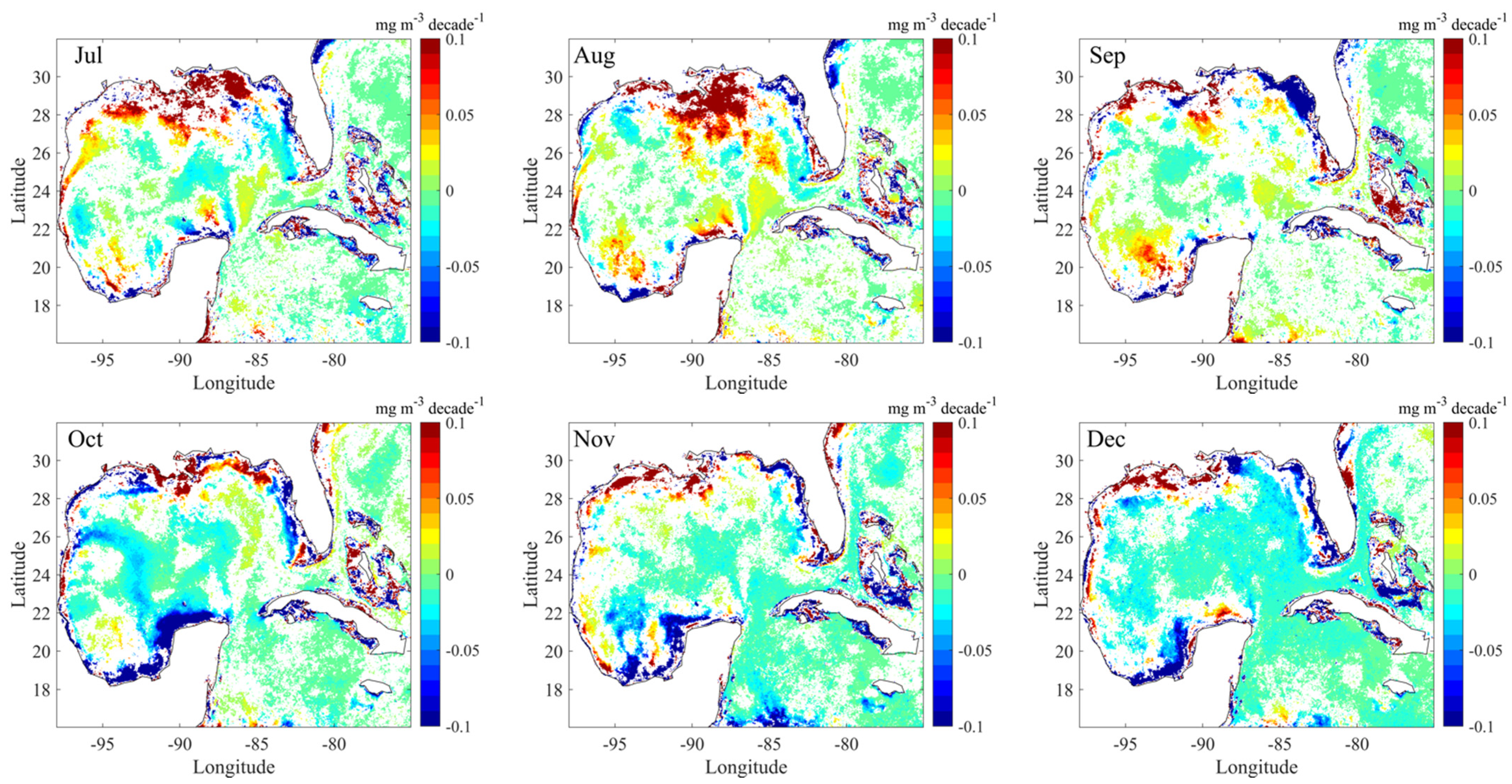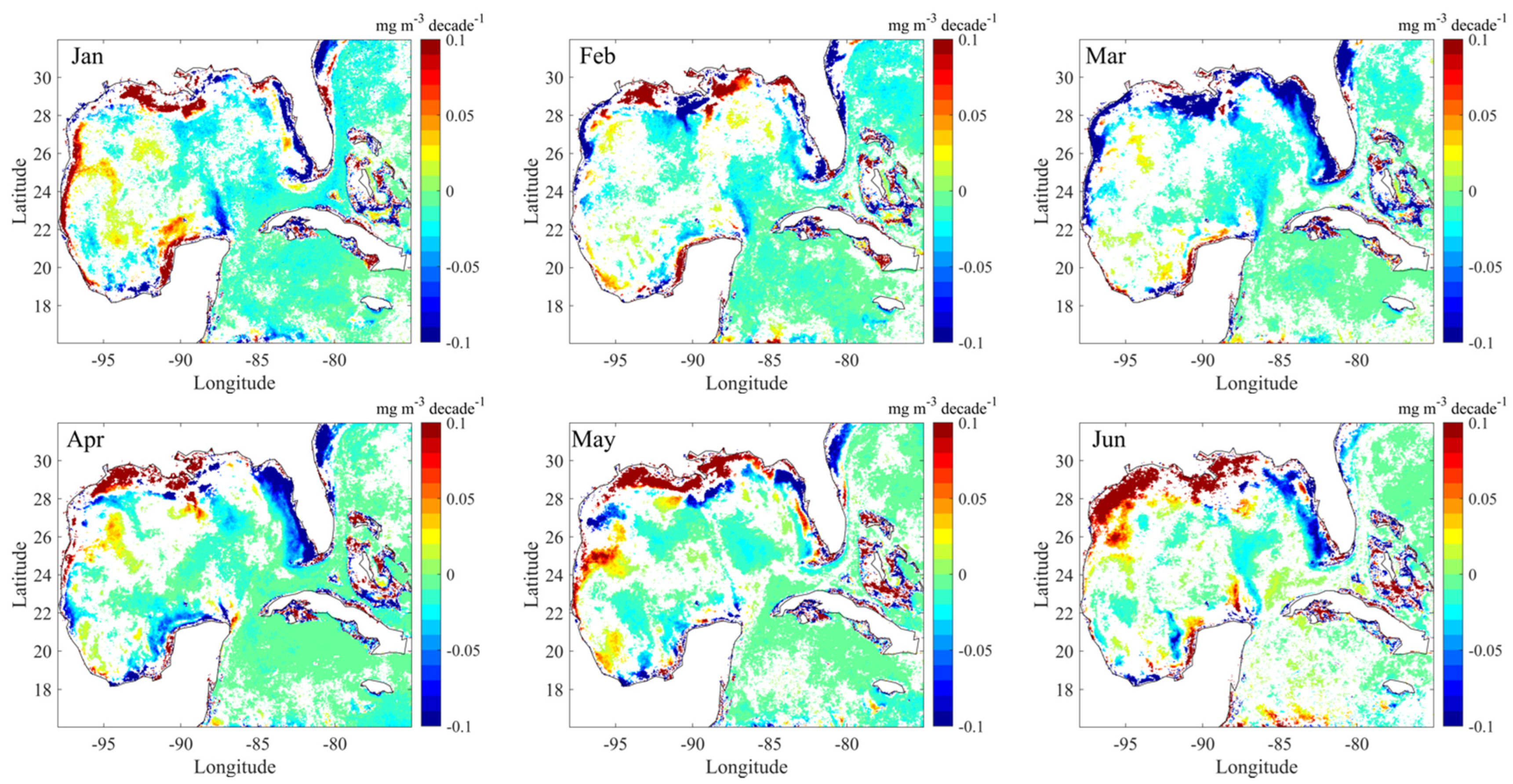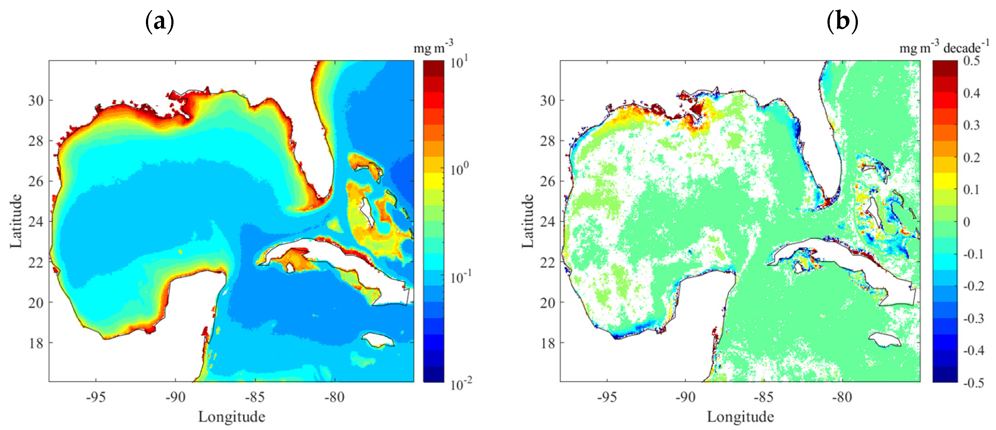 Li, G.; Wang, Z.; Wang, B. Multidecade Trends of Sea Surface Temperature, Chlorophyll-a Concentration, and Ocean Eddies in the Gulf of Mexico. Remote Sens. 2022, 14, 3754. https://doi.org/10.3390/rs14153754