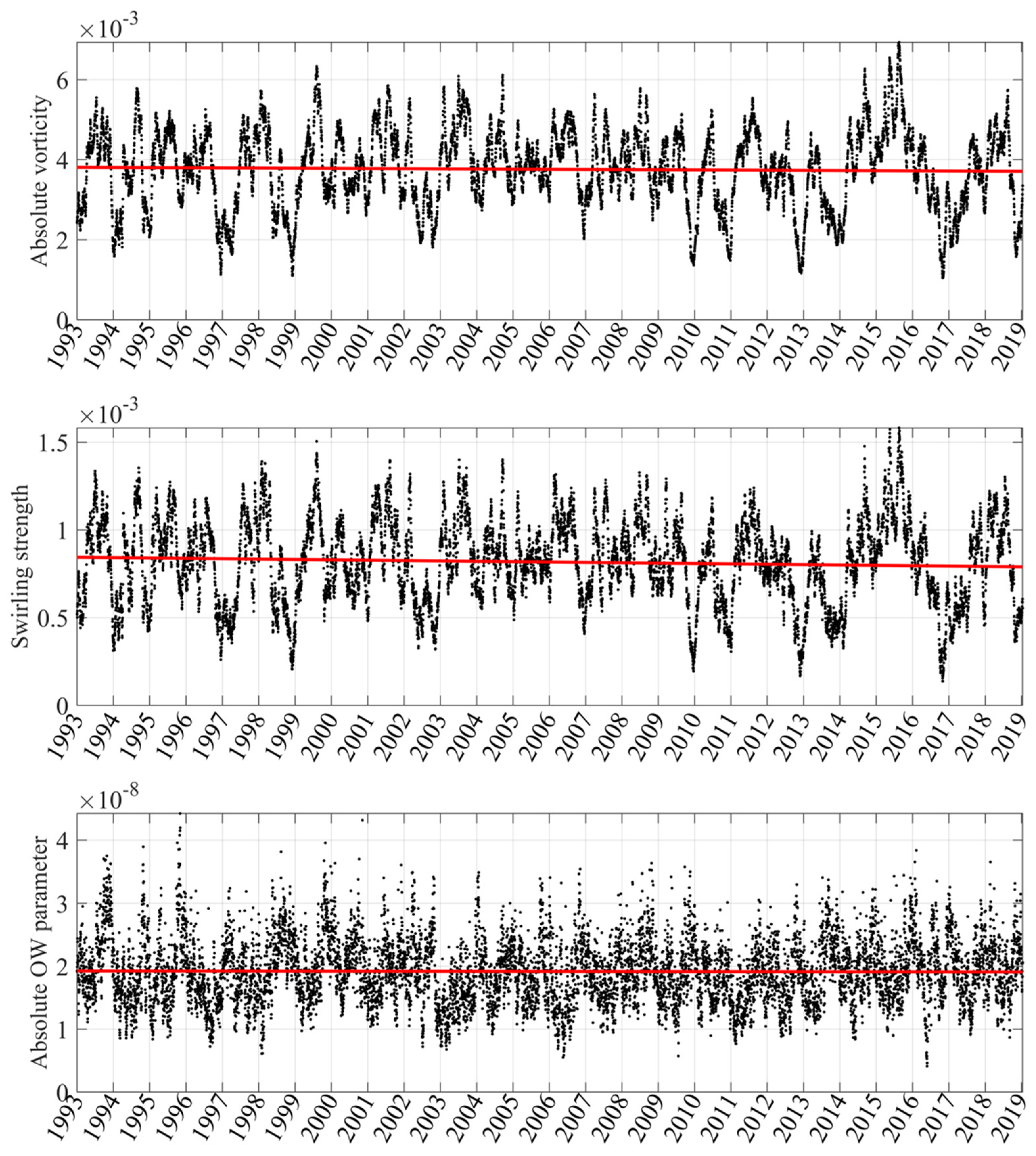 - Okubo–Weiss parameter [38]:where and are normal and shear strain, respectively.