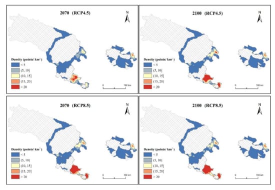 | Kernel density (points/km2) | Average | Yangtze | 1.729 | 2.525 | 46.07% | 2.553 | 2.464 | −3.47% |
