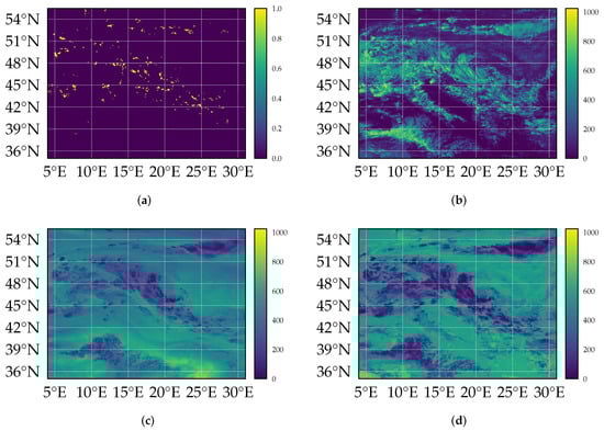 denoted as , where t is the time at which the image capturing has begun, and are the longitude and latitude, respectively, and refers to the wave-length band measured. The specific satellite imagery used is provided via the Spinning Enhanced Visible and InfraRed Imager (SEVIRI) of the Meteosat Second Generation (MSG) system, and obtained from EUMETSAT []. Images are available in 12 discrete frequency bands with a finite temporal resolution of min. Eight bands represent the thermal infrared (IR) range, providing radiance resulting from the emission of the atmosphere and the Earth surface. They can by used to estimate the brightness temperature of the atmosphere and the surface. Three channels in the visible (VIS) spectrum measure the reflection of solar light at clouds or the Earth’s surface. This information can be used to retrieve the albedo of clouds and the surface. Lastly, the High-Resolution Visible (HRV) channel contains multiple broadband detection elements to scan the Earth with a lower sampling distance. The spatial resolution of the satellite images in Central Europe is roughly latitude and longitude (except the HRV band, which we do not consider). All satellite data are projected to an equirectangular projection with an equal spatial resolution of . We represent the satellite data as collections of 2D images as data with values quantized to a 16-bit integer. Figure 1b–d show examples of processed satellite imagery of the VIS006 (m), WV062 (m), and IR120 (m) channels at 4 June 2016 at 12:00 h UTC, where a lot of lightning occurred across Central Europe. The images already indicate that the optical band might be more informative, as the infrared channels only see the cloud tops. However, the patterns in the visible spectrum are complex and not easy to capture in a hand-designed classifier.