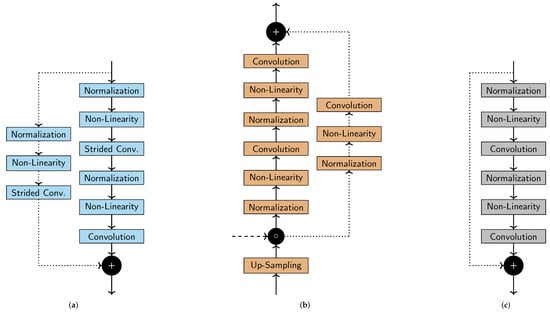 The residual blocks consist of full pre-activation units, optionally paired with pre-activated convolution shortcuts, as described in []. Figure 3 illustrates the used residual (Figure 3c), down-sampling (Figure 3a), and up-sampling blocks (Figure 3b). Convolution layers use filters for up- and down-sampling, and otherwise. Non-linear layers consist of ReLU [] activation functions.