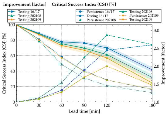 Improvement factor (right y-axis) and CSI (left y-axis) over lead time: Performance measures using CSI for a search radius of 30.61 km of our method for various data sets. All lines showing the improvement factor start at the bottom-left, and all lines showing the CSI start at the top-left.
