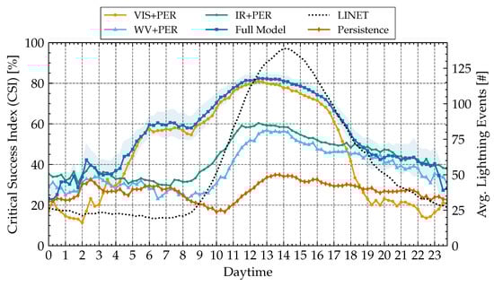 Figure 6 shows the result of training the classifier again, but with some inputs omitted. The graph shows the CSI over the course of the day, with an overlay of the number of lightning events recorded by LINET (dotted black curve) at these times of day on average (clearly peaking in the afternoon UTC time, which is late afternoon local time in the observed region). The time on the x-axis denotes to the prediction time and corresponds to the number of lightning events shown (the actual data used for the prediction are taken 2 h prior).