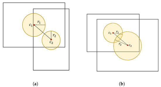 Circles in which the Euclidean distance between the center points is less than the sum of the radii are removed and considered as the same object. Therefore, only the maximum score between the overlapped circles remains, and the rest are removed. In the converse case, each circle is considered as an independent object. Figure 3a shows a situation in which both bounding boxes are maintained as they indicate two different objects, and Figure 3b shows a situation in which one bounding box with a low score is removed as it is considered to indicate the same object. The overall DBC-NMS process is shown in Algorithm 1.