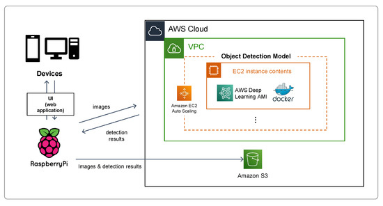 The server for object detection uses AWS cloud resources, as shown in Figure 4. The object-detection model is configured with Docker so that it can be simply deployed on top of the default AWS Deep Learning AMI environment at an AWS EC2 GPU instance. In addition, the EC2 instance is created as an auto-scaling group to facilitate expansion according to the number of users.