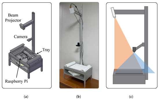Local hardware device. (a) Cad design of the local device. (b) Photo of the local device. (c) Configuration of the camera and beam projector.