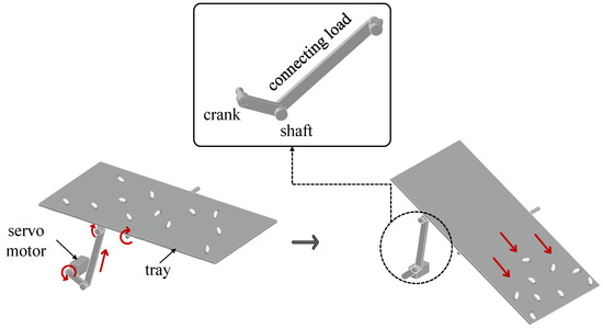 The local hardware device is designed using AutoCAD, as described in Figure 5a, and the entire structure is assembled from aluminum profiles, as shown in Figure 5b. The tray used for collecting the objects is fabricated using a 3D printer. A low-cost embedded board, Raspberry Pi 4 model B with 8gb memory, is employed as the main computer of this device. It receives images from the camera, exchanges data with the cloud-based object detection server, deploys a web application, highlights the items to be removed by controlling the beam projector, and collects items by actuating a motor. A mini DLP beam projector SC497 is used as the beam projector, and a Logitech Pro Stream webcam C922 is employed as the camera. To align the beam projector and the camera angle, the camera is set vertically to view the tray, as shown in Figure 5c. In addition, the beam projector is adjusted to an angle of view, which prevents interference with the camera. To collect items, a basic Raspberry Pi servo motor is used. The rotational motion generated by the motor is converted to linear motion through a crank, shaft, and connecting rod, as shown in Figure 6. Owing to the circular bar inserted in the middle of the tray, the converted linear motion is once again converted into rotational motion, which allows the objects to fall.