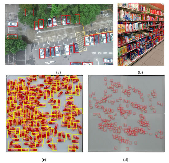 Dataset samples: (a) CARPK [15]; (b) SKU-110k [16]; (c,d) Pill dataset.