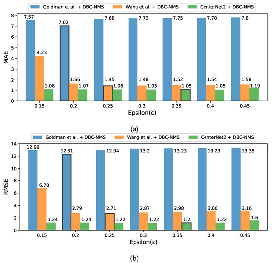 To evaluate the performance of DBC-NMS according to epsilon, we conducted experiments with values ranging from 0.15 to 0.45 on the Pill dataset. Figure 10 shows the performance change according to epsilon for the three models compared in Section 4.5. Goldman et al. showed better performance of 7.024 MAE and 12.307 RMSE for = 0.2 compared with other values. In the cases of Wang et al. and CenterNet2, = 0.35 produced better results with 1.245 MAE and 1.982 RMSE and 1.05 MAE and 1.202 RMSE, respectively.